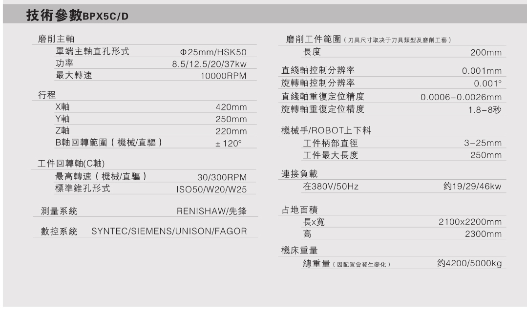 BPX5系列八軸五聯(lián)動(dòng)精密高效工具磨床適用于IT、汽車、航空、醫(yī)療、木工刀、多晶體CBN等金屬切削刀具行業(yè)生產(chǎn)Φ3-16/25mm的圓形或非圓形切削刀 具。機(jī)床可配置自動(dòng)上下料和防撞系統(tǒng),精密裝夾機(jī)構(gòu)和創(chuàng)新的刀具精密支撐系統(tǒng)。